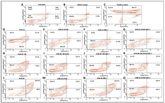 Annexin V-FITC/propidium iodide (PI) analysis of HeLa cells treated with 250 µg/mL of the A. orientalis dichloromethane leaf (AOD (L)) fraction or 125 and 250 µg/mL n-butanol stem (AOB (S)) fraction for 24 h. Samples: (A) Untreated; (B) DMSO control; (C) Positive control-treated; (D) 250 µg/mL AOD (L)-treated; (E) 250 µg/mL AOD (L)-treated cells pretreated with ZVAD, or (F) NEC-1, or (G) both; (H) 125 µg/mL AOB (S)-treated; (I) 125 µg/mL AOB (S)-treated cells pretreated with ZVAD, or (J) NEC-1, or (K) both; (L) 250 µg/mL AOB (S)-treated; (M) 250 µg/mL AOB (S)-treated cells pretreated with ZVAD, or (N) NEC-1, or (O) both. ZVAD = Z-VAD-FMK; NEC-1, Necrostatin 1. The DMSO Control sample contains the same amount of DMSO as in the 250 µg/mL sample of the treatment.