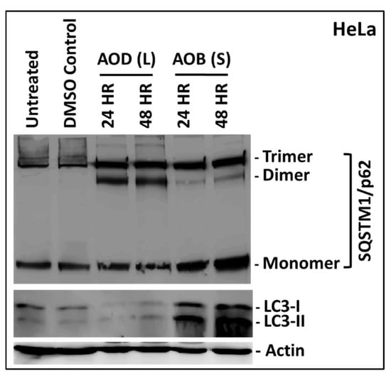 Since the two fractions had the potential to induce apoptosis as well as necroptosis, we next explored whether these fractions had the ability to induce autophagy, a type II programmed cell death pathway that is activated by anticancer agents [37,38,39]. As can be seen from Figure 9, treatment of HeLa cells with AOD (L) for 24 h was sufficient to induce the expression of both dimeric and trimeric forms of SQSTIM1 over and above the ones present in the untreated and DMSO-treated cells (first two lanes in Figure 9). These forms have been reported in literature recently that arise as a result of oxidative stress on the cell, causing oligomerization of the protein [40]. Treatment with AOB (S) also affected SQSTM1, but resulted in further induction of the monomeric and trimeric forms, at the expense of dimeric forms (Figure 9). This pattern of induction and oligomerization of SQSTM1 by AOB (S) was clearly different from the one observed for AOB (L), supporting our observation that AOD (L) and AOB (S) affect HeLa cells differently. Analysis of LC3 by western blot further confirmed these observations since AOD (L) led to degradation of LC3-I, while treatment with AOB (S) led to an increase in both the LC3-I and LC3-II forms of the protein (Figure 9, bottom panel). These results suggest that both AOD (L) and AOB (S) fractions have bioactive compounds that perturb autophagy. The mechanism of their action remains to be explored in future studies.