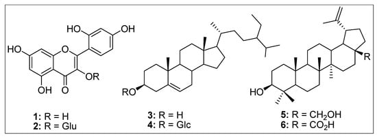Structures of some the compounds isolated from A. orientalis. 1: Morin, 2: Morin-3-O-β-D-glucopyranoside, 3: β-sitosterol, 4: β-sitosterol-3-O-β-D-glucopyranoside, 5: Betuline, and 6: Betulinic acid.