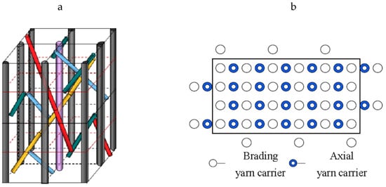 In practical engineering applications, composites are often affected by a high-temperature environment [11]. This will cause stress and strain changes to the composites, thus affecting the normal working and mechanical properties of the composites [12]. Therefore, composites are required to have high environmental adaptability and maintain high structural stability despite drastic environmental changes. Compared with laminated composites, 3Dim–5Dir braided composites have better mechanical properties in the braiding direction due to added axial yarns. The axial yarns do not participate in the braiding, but they are surrounded by braided yarns. The inner ideal structure of 3Dim–5Dir braided fabric is shown in Figure 1a. The ratio of braided yarn and axial yarns is 1:1, and the arranged form of braided yarns and axial yarns on the chassis of braiding machine by rows and columns is shown in Figure 1b. In this paper, the structure of the specimen is a 3Dim–5Dir braided structure and the ratio of the braided yarns and the axial yarns is 1:1. However, the ratio of the braided yarns and the axial yarns could be different. For example, the ratio may be 2:1, 3:1, or 4:1, and the type and thickness of the axial yarns could be different from the braided yarns [13].