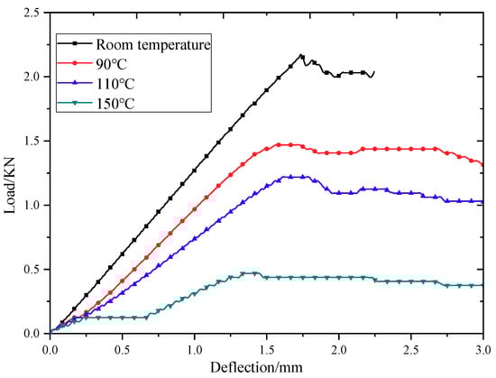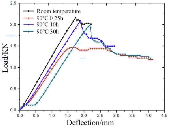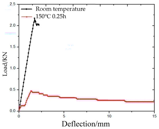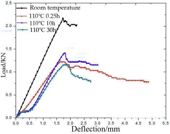 From Figure 4, it can be observed that the bending deflection–load curve at room temperature is linear, while the bending deflection–load curve at 150 °C is non-linear, and the bending strength at 150 °C is far less than that at room temperature. When the material is placed at 150 °C for 0.25 h, a plastic platform region appears in the deflection–load curve. With the increase of the deflection, the material shows a certain linear relationship. After the material reaches its maximum, the material slowly decreases stepwise.