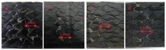 Figure 9a–d show the compressive surface morphologies of 3Dim–5Dir braided composites subjected to bending fracture at room temperature, 110 °C for 0.25 h, 10 h, and 30 h respectively. Figure 9b is the upper form of bending fracture of braided composites lasting 0.25 h at 110 °C. Compared with the other three figures, in Figure 9b there are many obvious cracks, and the specimen is most seriously damaged. This is because the specimen suddenly enters a higher-temperature environment, and the unstable resin properties lead to the unstable performance of the whole material. The matrix on the upper surface is first cracked by extrusion, and then the bond between the fibers and the resin is destroyed. Finally, the fibers are extruded and the cracks expand rapidly. In Figure 9c, the graph shows the compressive surface of the material with 10 h bending fracture at 110 °C. Form Figure 9c, it can be found that there are only a few cracks in the graph, and the cracks are very small. When the material is at 110 °C for 10 h, the resin changes from an unstable state to a stable state, and the residual stress in the material is released to a certain extent, so the damage is not very serious. Figure 9d shows the upper surface morphology of the braided composites which were ruptured by bending stress after lasting for 30 h at 110 °C. The specimens also show that the surface peeling of the matrix and the fiber bundles under compressive stress is not as obvious as under normal temperature. This is due to the long duration of high temperature, the plastic deformation of the matrix is more obvious, the matrix softening, and the failure of the specimens is caused by the compressive stress of the fiber bundles under mutual extrusion and ultimate shear failure.