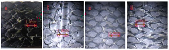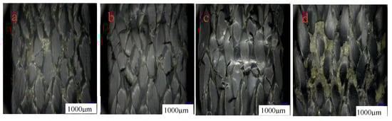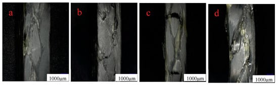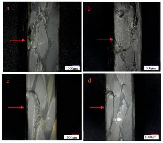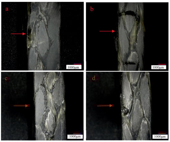 Figure 10a–d show the side morphologies of braided composites that are placed for 0.25 h at room temperature, 110 °C, 10 h, and 30 h after being bent, 30 times larger under a microscope. In Figure 10b, a crack perpendicular to the forming direction of the braided composites can be observed. Careful observation of the cracks does not show that the fibers break each other, and the resin does not break. This is because the resin is unstable at high temperature. When the specimen is subjected to bending force, the resin cannot transmit the force well. The fibers are handed over to each other, and the fibers press each other, resulting in the slipping and filing of the overlapping fibers. At the same time, cracks along the braiding angle can be observed on the cracked fiber bundles, and the phenomenon of separation between fibers can be observed under the electron microscope. From Figure 10c, it can be observed that the resin aggregates along the braiding angle of the fibers, and there are no obvious cracks on the compression surface. In Figure 10d, it shows that the 3Dim–5Dir braided composites, which are placed at 110 °C for 30 h, have many cracks along the yarn braiding angle when they are bent.
