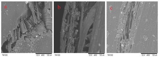 Figure 15a–c show the electron microscopic pictures of side cracks of 3Dim–5Dir braided composite specimens after 0.25 h of heating at room temperature, 90 °C and 110 °C, respectively. From Figure 15a, it can be found that many fiber breaks are regular, and only a few fibers are pulled out. It shows that the resin–fiber bonded 3Dim braided composites can withstand external loads well at room temperature. Most fiber breaks result in large defects in the material. Failure of 3Dim braided composites. Figure 15b shows that the debonding phenomenon between resin and fiber is obvious when the 3Dim–5Dir braided material is retained at 90 °C for 0.25 h. It can be seen not only that there are many block resins on the fibers, but also that the fibers in a bunch of fibers are separated from each other, resulting in delamination. Figure 15c shows the separation between fibers, the debonding between fibers, and matrix accompanied by matrix shedding. It can be seen that temperature has a significant effect on the 3Dim–5Dir braided composites at 110 °C, although the time of temperature effect on the 3Dim–5Dir braided composites is only 0.25 h.