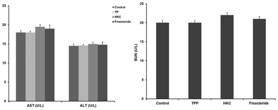 HKC was safe as there were no significant differences in alanine aminotransferase (ALT) and aspartate transaminase (AST) activities among all of the groups. Similarly, blood urea nitrogen (BUN) was not significantly different from the control group, so it did not affect renal toxicity in HKC intake (Figure 1).