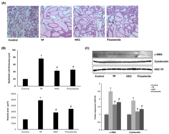 The control group showed the normal histological architecture of the prostate. The TP-treated group showed epithelial hyperplasia with a prostatic acini area as well as enlarged blood vessels. Co-treatment with HKC attenuated the pathological alterations induced by TP. HKC-treated group (42.5 ± 3.7 µm, 2840 ± 212 µm2) and finasteride-treated group (45.2 ± 2.8 µm, 3450 ± 153 µm2) also showed reductions in epithelial thickness (Figure 3A,B). It suggested that the HKC used in this study was capable of controlling prostate weight and the thickness of prostate tissue. One of the causes of enlargement of the prostate is due to the unequal hyperplasia of prostate stromal cells, which can be confirmed by the increased expression of α-smooth muscle actin (α-SMA) or cytokeratin in activated stromal cells. As shown in Figure 3C, the expression of α-SMA and cytokeratin was increased by TP treatment in the prostatic hypertrophy-induced group, but it was decreased by administration of the extract of HKC and finasteride.