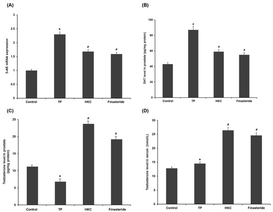 In the pathogenesis of BPH, testosterone was transferred to DHT by the activation of 5-AR in the prostate. TP administration significantly increased mRNA of 5-AR compared to the control group. Co-administration of HKC reduced this TP-mediated elevation from the TP-treated group. The finasteride-treated group also showed a down-regulated expression of 5-AR (Figure 4A).