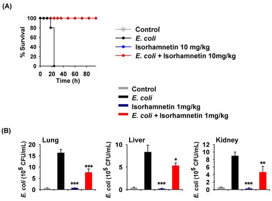It was previously reported that isorhamnetin can reduce inflammation by downregulating nitric oxide (NO) and cytokine production []. Therefore, we sought to examine the ability of isorhamnetin to protect mice from E. coli-induced sepsis. To establish a bacterial sepsis model, we used a virulent E. coli K1 strain to infect isorhamnetin-pretreated mice for 96 h for survival assays and 18 h to examine inflammation. As depicted in Figure 2A, mice in the isorhamnetin-treated group survived until the end of the experiment, but the E. coli-treated mice died within 24 h of infection. Further, we assessed the bacterial burden in the visceral organs of the mice (lung, liver, and kidneys) and found that isorhamnetin treatment significantly reduced the bacterial population in all organs compared to that in the E. coli only group (Figure 2B). Although isorhamnetin has no antibacterial activity in vitro, it is reported to enhance macrophage functions, such as phagocytosis, by increasing superoxide generation after the engulfment of bacteria []. Thus, we speculate that the reduction in bacterial loads in the organs is a result of the immunomodulatory potential of isorhamnetin.