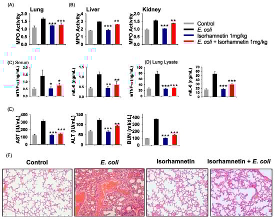 In vivo anti-inflammatory and toxicity evaluation of isorhamnetin. (A,B) Examination of myeloperoxidase (MPO) activity in lung, liver and kidney. (C,D) Production of cytokines (TNF-α, IL-6) in the sera and lung lysates. (E) Aspartate aminotransferase (AST), alanine amino transferase (ALT) and blood urea nitrogen (BUN) levels in the serum. (F) Hematoxylin and eosin staining of the lung tissue. Data are presented as the means ± SEM. * p < 0.05; ** p < 0.01; and *** p < 0.001 compared to the E. coli group.