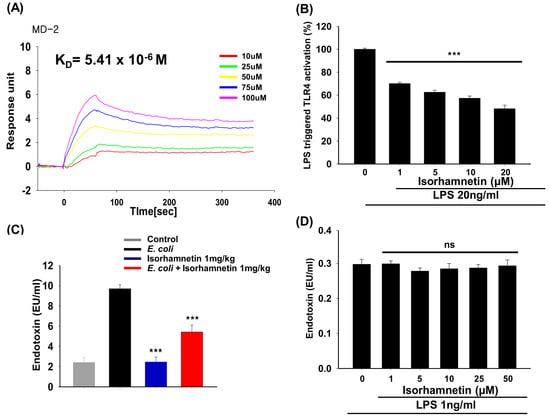 As we observed that isorhamnetin could successfully promote the survival of E. coli-infected mice and ameliorate inflammation, we next determined its probable mechanism of action. Isorhamnetin was previously reported to downregulate the TLR4 pathway [], which has a crucial role in the development of inflammation. We therefore measured the binding affinity of isorhamnetin to MD-2 by surface plasmon resonance (SPR), as it is reported that MD-2 is responsible for binding hydrophobic LPS and other small molecules [], which eventually induces the dimerization of TLR4/MD-2.