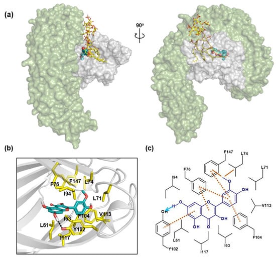 To understand the interaction between isorhamnetin and MD-2 at the molecular level, a binding model of isorhamnetin to MD-2 was determined by a docking simulation. A model of the binding between isorhamnetin and MD-2 shows that isorhamnetin was inserted into the hydrophobic binding pocket of MD-2, which is a part of the LPS-binding site (Figure 5a). Isorhamnetin also exhibits extensive hydrophobic interactions with MD-2. Further, the 3′-OCH3 of isorhamnetin bound to the deep hydrophobic pocket of MD-2, forming hydrophobic interactions with Leu74 and Phe147. The B ring is also shown to form two pi–pi interactions with Phe104 and Phe147, whereas Tyr102 forms pi–pi interactions with the A ring. Furthermore, pi interactions were observed between the C ring of isorhamnetin and Leu61 and Ile117, with one between the B ring and I63, L71, L74 and V113, as shown in the two-dimensional plots of Figure 5b,c. Therefore, isorhamnetin displays extensive hydrophobic interactions with the hydrophobic pockets of MD-2, resulting in a tight binding affinity. Furthermore, 7–OH of isorhamnetin forms a hydrogen bond with Tyr102. It was reported that xanthohumol and curcumin also exhibit the same interactions with Tyr102 of MD-2 [,]. Docking studies and mutation studies of R90A and Y102A show that Arg90 and Tyr102 are the crucial residues required for the recognition process during inhibitor binding to the MD-2 protein [,,]. These results confirm that Tyr102 might be the crucial residue required for binding between isorhamnetin and MD-2.