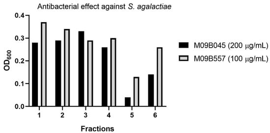 Anti-bacterial effect of the fractions generated by flash liquid chromatography from extracts of the cultures of the two Algibacter strains M09B045 and M09B557. Note that the tested assay concentrations are different for the two strains but the purpose of the test was to identify candidates for isolation rather than quantitative comparison of bioactivity.