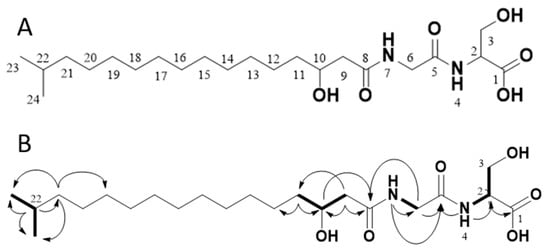 The structure of the isolated compound Lipid 430 (1) (A) and 2D-NMR correlations measured from our isolated sample (B). In B, selected COSY correlations are indicated in bold bonds and selected HMBC correlations are shown as arrows. The structure proposed upon the NMR data complies with Lipid 430 (1).