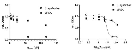 Anti-microbial effect of Lipid 430 (1) on S. agalactiae (two technical replicates in two experiments) and MRSA (two technical replicates). IC50 for S. agalactiae was 30.16 µM using a sigmoidal fit (Span ± 0.91 µM; Degrees of Freedom 20; R squared 0.97; Adjusted R squared 0.97, Sum of squares 0.13). IC50 of MRSA is >116 µM and was not determined.