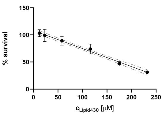 Cytotoxic effect of Lipid 430 (1) against the A2058 melanoma cell line. A linear correlation with % Survival = −0.00332c+1.08 {c ∈ ℝ | c ≥ 12 µM ^ c ≤ 233 µM} was found (R square 0.93, Sy.x 0.07442). The 95% Confidence intervals are shown in dot lines. The calculated IC50 for 1 in the linear model is 175 µM.