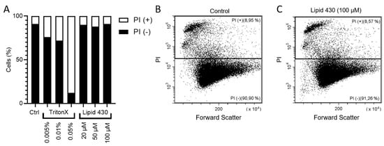 Results of the flow cytometry experiments with melanoma cell line A2058. In (A) the relative ratio between PI positive (+) and PI negative (−) is shown. The exact results are the following: stained control (Ctrl.), 8.46% PI+; 0.01% TritonX, 27.61% PI+; 0.05% TritonX, 87.38% PI+; 20 µM 1, 9.45% PI+; 50 µM Lipid 430, 11.26% PI+; 100 µM Lipid 430, 8.72% PI+. (B) depicts the flow cytometry results as dot plot graph of the stained control and in (C) a dot plot graph of the cells threated with 100 µM 1 is given. Forward scatter is displayed on the X-axis and propidium iodide absorption on the Y-axis. The relative ratio of events is given in %.