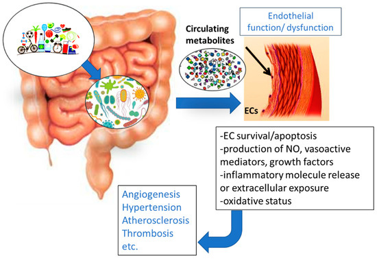 Beside exogenous derivatives, we can hypothesize that there are endogenously produced metabolites in circulation able to influence endothelial cell behavior. Among them, particular attention in this review has been paid to metabolites derived from gut microbiota (GM) metabolism.