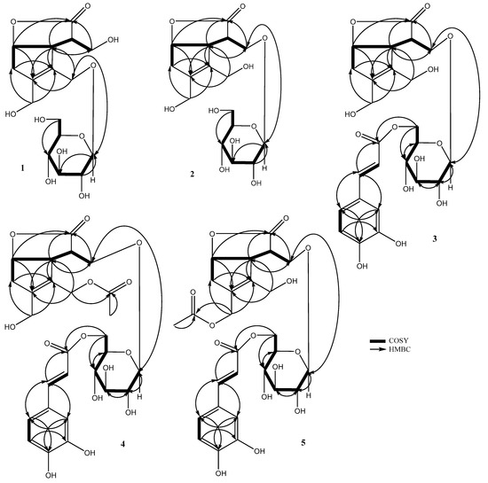 Correlation spectroscopy (COSY) and heteronuclear multiple bond connectivity correlation (HMBC) correlations of 1–5.