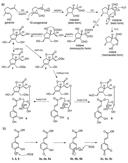 Plausible biosynthetic pathway of compounds 1–5, and possible antioxidant mechanism of compounds 3–5. (a) Plausible biosynthetic pathway. Iridotrial (keto form) is a common substrate for the production of iridane and iridoid skeletons. [O]; oxidation. (b) Possible antioxidant mechanism. The conjugated para-OH is the expected primary target of reactive oxygen species (ROS) to generate phenoxy radials 3–5a. The second ROS attack results in the formation of ortho quinones, 3–5c, through the resonance structures 3–5b.