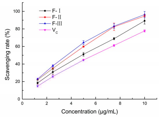 The 2,2′-azino-bis-3-ethylbenzthiazoline-6-sulphonic acid (ABTS+) radical scavenging abilities of the three polyphenol fractions from lotus seed epicarp (F-I, F-II, and F-III) are shown in Figure 2. Compared to Vc, the ABTS+ radical scavenging capacities of the three polyphenol fractions were higher than that of Vc (p < 0.05). The IC50 values of F-I, F-II, and F-III were 5.04, 4.22, and 3.96 μg/mL, respectively. The result was lower than that of purified polyphenols from lotus seed epicarp (45.27 μg/mL) reported by Liu, Ma, Ibrahim, Li, Yang and Huang [17]. The better ABTS+ radical scavenging capacities of our polyphenol fractions might be due to the synergistic effect of various polyphenols. Generally, the ABTS+ radical scavenging capacities increased in the order of: F-III > F-II > F-I. Furthermore, at the concentration of 10 μg/mL, the ABTS+ radical scavenging rates of F-I, F-II, and F-III were 89.16%, 94.60%, and 96.38%, respectively. Our results indicate that the three polyphenol fractions from lotus seed epicarp had potential anti-radical activity on the ABTS+ radical.