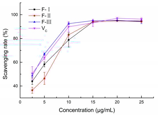 The 1,1-diphenyl-2-picryl-hydrazyl (DPPH) radical scavenging abilities of F-I, F-II, F-III and Vc are shown in Figure 3. The DPPH radical scavenging rates of the three polyphenol fractions firstly increased to the peak rate at the concentration of 15 μg/mL, and then the scavenging rates decreased steadily. F-III had a better anti-radical activity on DPPH than that of Vc, whereas the DPPH radical scavenging rates of F-I and F-II were lower than that of Vc at the same concentration. The IC50 values of F-I, F-II, and F-III were 3.50, 4.75, and 2.26 μg/mL, respectively. The DPPH radical scavenging activity increased in the order of: F-III > F-I > F-II. Moreover, at a concentration of 15 μg/mL, the DPPH radical scavenging rates of F-I, F-II, and F-III reached 93.90%, 94.11%, and 95.03%, respectively. Our results thus indicated that the three polyphenol fractions from lotus seed epicarp had positive scavenging capacities on the DPPH radical.