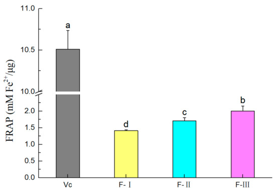 The ferric ion reducing antioxidant power (FRAP) of the three polyphenol fractions are shown in Figure 4. The FRAP values of F-I, F-II, and F-III were 1.41, 1.70, and 2.00 mMFe2+/µg, respectively. The results indicated that the FRAP of the polyphenol fractions increased in the order of: F-III > F-II > F-I (p < 0.05). The FRAP values were higher than other reported polyphenols [29,30]. Our results suggest that three polyphenol fractions from lotus seed epicarp had high FRAP levels.