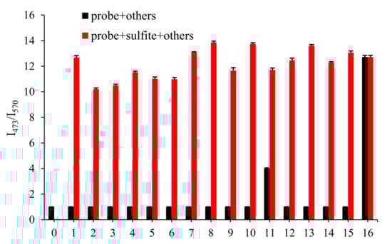 The excellent selectivity of the probe played an essential role in practical application. In order to illustrate its anti-interference ability, we detected the fluorescence changes of probe EB (10 μM) with 500 μM other anions after 3 min, which aimed to prove no interference of the most common anions and biological thiols in the environment, including CO32−, HCO3−, Ac-, PO43−, HPO42−, H2PO4−, Cl−, Br−, I−, NO2−, S2−, SO42−, Hcy, Cys and GSH. As shown in Figure 2 (black), even 50 equivalents of the other species did not respond to the fluorescence ratio I473/570, but S2− led to a slight increase of the fluorescence ratio I473/570, which may be influenced by the nucleophilicity of S2−. Meanwhile, in Figure 2 (red), the competition experiments meant that other analytes did not influence on detecting SO32− (500 μM). The results showed great selectivity of probe EB towards SO32−, which indicated the excellent ability in the further application.