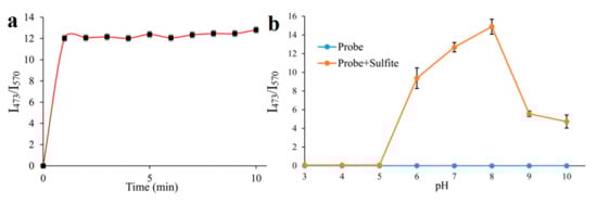 (a): Effect of time on the I473/I570 fluorescence intensity ratio of probe EB (10 μM) in PBS solution (pH = 7.4) upon addition of 500 μM SO32−; (b): Effect of pH on the I473/I570 fluorescence intensity ratio of probe EB (10 μM) and probe EB upon addition of 500 μM SO32−.