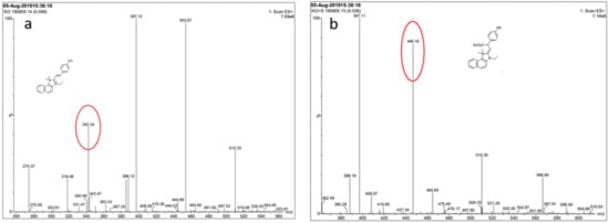 Mass spectrum of probe EB and the crude product of the probe with SO32−. (a) Probe EB in MeOH. (b) Probe EB with Na2SO3 in MeOH: H2O (1:1).