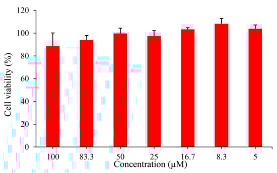 The application of the probe for cell bioimaging was studied based on the results above. Cytotoxicity experiment was firstly incubated in HepG2 cells using Cell Counting Kit-8 (CCK8), and as shown in Figure 5, the survival rate of HepG2 cells was about to reach 90 % after incubating with 100 μM probe EB for 24 h, which suggested that the probe has low cytotoxicity for application in living cells.