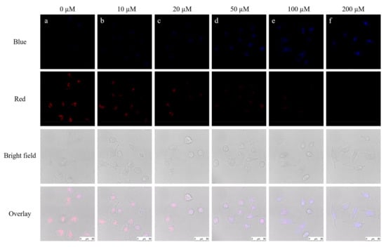To verify the biological applications of the probe, we tried to explore potentialities about detecting SO32– in living cells. Firstly, we incubated the HepG2 with various concentrations of SO32– (0, 10, 20, 50, 100, 200 μM) for 2 h. After that quantitative probe (10 μM) was added into all cell groups waiting for 2 h, and monitoring tests were operated by the confocal laser-scanning microscopy. HepG2 cells showed a clear red profile after the incubation with probe (10 μM) for 2 h (Figure 6a), which suggested that the probe EB could permeate into HepG2 cells. While HepG2 cells were incubated with different concentrations of SO32– (0, 10, 20, 50, 100, 200 μM) for 2 h beforehand and then incubated with the probe EB. After 2 h, the fluorescence in the blue channel enhanced with the concentration of SO32− raised, but the fluorescence under the red channel degraded (Figure 6a–f). Finally, the HepG2 cells (Figure 6f) displayed strong blue fluorescence and weak red fluorescence. Therefore, the probe EB could be employed for the SO32− fluorescence imaging in living cells.