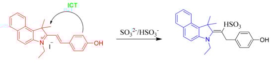 Compared with traditional detection methods like titration [13], electrochemistry [14,15] and capillary electrophoresis [16,17], fluorescent probes have strengths in operation, sensitivity and selectivity, and can be applied in real-time bioimaging in vivo. Fluorescent probes based on the (E)-1,1,3-trimethyl-2-styryl-1H-benzo[e]indol-3-ium platform are popular because of their strong fluorescence, good water solubility and relatively large Stokes shift. For example, based on the skeleton (E)-1,1,3-trimethyl-2-styryl-1H-benzo[e]indol-3-ium with acetyl substitution, a probe reported by Zhou et al. can usefully test carboxylesterase [18]. Nowadays, there are some fluorescent probes based on different reaction mechanisms to detect SO32−/HSO3−, such as 1,4-Michael addition [19,20,21,22], nucleophilic 1,2-addition [11,23] and deprotection of levulinate [24]. However, most fluorescent probes were based on limitedly single fluorescence changes, which will be influenced due to fluctuations in the system and the probe’s concentration. For example, a probe reported by Yu et al. can usefully test SO32−/HSO3−, but a single fluorescence change was used, which limited its use [25]. While the ratiometric fluorescent probes can gain more accurate results for its capacity to detect fluorescence emission/excitation intensities at two different wavelengths [26,27]. Therefore, compared with the single fluorescent probes, it is evitable for the ratiometric fluorescent probes to be influenced by the environmental changes [28]. Based on the ratiometric fluorescent probes, a probe with CF3 substitution reported by Sun et al. can usefully test SO32−/HSO3−, but the probe also reacted with CN−, which was a low selectivity for its practical applications [19]. In order to develop new fluorescent probes for SO32−/HSO3− detection [29], we paid more attention to developing a ratiometric probe that could satisfy the practical applications.