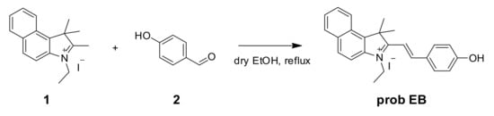 On account of the ideas above, we first developed a novel ratiometric fluorescent probe EB (E)-3-ethyl-2-(4-hydroxystyryl)-1,1-dimethyl-1H-benzo[e]indol-3-ium iodide for sensing SO32−/HSO3− (Scheme 1), which is based on the nucleophilic reaction between SO32−/HSO3− and the C=C bond. The 3-ethyl-1,1,2-trimethyl-1H-benzo[e]indol-3-ium iodide (the hemicyanine part) and 4-hydroxybenzaldehyde were used to synthesize the probe as the intramolecular charge transfer (ICT) donor and the acceptor respectively [30,31]. The hemicyanine was proved to be the effective fluorophores in designing fluorescent chemosensors, which had a blue fluorescence with high quantum efficiency and the chemical stability [20,32,33,34]. After the specific 1,4-addition reaction of SO32–/HSO3– with the vinyl group of probe EB (Scheme 1), the structure of probe EB was destroyed by SO2 derivatives. Therefore, because of the obvious emission between probe EB and the hemicyanine derivative, we could detect two well-resolved emission bands before and after addition of SO32–/HSO3–. Thus, we could observe significant changes in the UV-Vis absorption spectra and fluorescence spectra and make the colorimetric and fluorogenic detection of SO3−/HSO32− possible. Scheme 2 showed the synthesis route of probe EB and the structure of probe EB was confirmed by 1H-NMR, 13C-NMR and MS (Figures S1–S3). What’s more, the probe showed excellent characteristics including the large hypsochromic shift, the ultrafast response time (within 60 s), high sensitivity (a detection limit of 28 nM), low cytotoxicity and excellent selectivity of SO2 derivatives over other anions and biothiols. Additionally, it could effectively monitor SO2 derivatives and successfully applied in real samples and living cells.