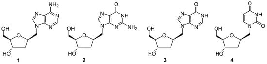 On the other hand, the introduction of a methylene bridge between a nucleobase and the sugar partly led to the formation of homonucleosides, which are known for their resistance to hydrolytic or enzymatic cleavage, as well as for the rotational freedom when compared with the natural nucleosides. Furthermore, it was shown that homonucleosides are substrates for cellular kinases and are able to pair with other nucleosides by Watson–Crick interactions without appreciable modifications of the structure of DNA (or RNA) molecules [18]. 1′-Homonucleosides containing adenine 1 or guanine 2 were found to be active against herpes simplex virus (minimum inhibitory concentration (MIC) = 5–20 µg/mL) and vaccinia virus [19,20,21], while compound 3 (IC50 = 25.2 µg/mL) showed activity against the influenza type virus AH1N1 (Figure 2) [22]. Homonucleoside analogue of 2′-deoxyuridine 4 has been described as a selective inhibitor of viral uracil-DNA glycosylase (UDG), while exerting only small effect on the human enzymes [23].