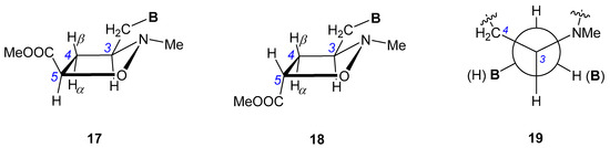 For the either cis or trans isoxazolidines containing uracil or substituted uracil residues 14a–14f, we also noticed that diastereotopic hydrogen atoms in CH2–base units which resonate at a lower field (4.05–3.89 ppm) showed significantly smaller vicinal coupling constants to H–C3 (3.3–3.9 Hz) than those associated with higher field signals (3.59–3.32 ppm) when values of 9.1–9.7 Hz were observed. One may conclude that high-field hydrogens are antiperiplanar to H–C3, while low-field ones are oriented gauche, as depicted by the Newman projection 19 (Figure 5). Although real reasons for the restricted rotation around C3–CH2Base bond remain obscure to us at the moment, they may simply reflect repulsive interactions of sterically bulky CH2–base groups with Me–N and Hβ–C4–Hα fragments.