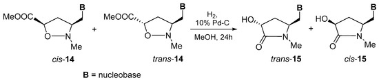 As we recently reported [45], the hydrogenation of uracil-containing isoxazolidine homonucleoside cis-14a (B = Ura) proceeded smoothly and the intramolecular cyclization of intermediary γ-aminocarboxylic ester to a γ-lactam was accompanied by hydrogenation of the uracil residue to produce the lactam trans-15g (B = diH-Ura) in a good yield (80%) instead of the expected compound trans-15a (B = Ura) (Table 2, entry a). Similarly, cis-15g (B = diH-Ura) was obtained from trans-14a (B = Ura) (85%).