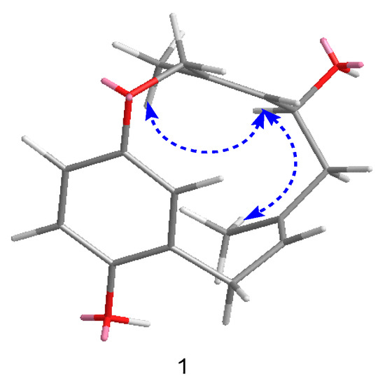 Compound 1 was isolated as a colorless powder. Its molecular formula was established to be C16H20O3 on the basis of high-resolution electrospray ionization mass spectroscopy (HRESIMS) at m/z 259.1329 [M − H]− (calcd for 259.1340), indicating seven degrees of unsaturation. It had an IR absorption band at 3417 cm−1, which suggested the presence of hydroxyl groups. The 1H-NMR spectrum (Table 1, supplementary Figure S1) of 1 revealed the presence of one ABX aromatic system at [δH 6.60(1H, d, J = 8.4 Hz, H-3), 6.56(1H, dd, J = 3.0, 8.4 Hz, H-2), 7.23(1H, d, J = 3.0 Hz, H-14)], three aliphatic methylenes [δH 3.04(1H, dd, J = 7.2, 16.8 Hz, H-6b), 3.34 (1H, dd, J = 8.4, 16.8 Hz, H-6a), 2.36 (1H, t, J = 12Hz, H-9b), 2.71(1H, dd, J = 4.2, 12 Hz, H-9a), 4.46(1H, d, J = 12.6Hz, H-13b), 4.64(1H, d, J = 12.6 Hz, H-13a)], two olefinic methines [δH 5.74(1H, t, J = 7.2Hz, H-7), 5.56(1H, d, J = 10.2Hz, H-11)], one oxygenated methine [δH 4.68(1H, m, H-10)], and two methyl groups [δH 1.56(3H, s, H3-15), 1.24(3H, s, H3-16)]. 13C-NMR analysis with the aid of the HSQC spectra of 1 revealed 20 carbon signals composed of two methyls, three methylenes, five olefinic methines, five olefinic quaternary carbons, and one oxygenated methine. The proton signal at δH 4.68 (1H, m, H-10), together with the downfield methine carbon signal at δC 66.0, suggested the existence of a hydroxy group. Comprehensive analysis of 1D-NMR data indicated the existence of a 1,2,4-substituted hydrobenzene unit and the monoterpene moiety.