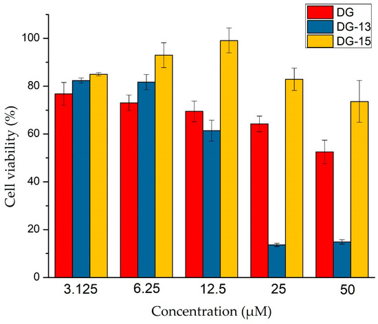 The H9c2 cells were transferred into individual wells of 96-well plate (4.0 × 103 cells/well) and cultured 24 h at 37 °C with 5% CO2. Compounds DG-13 and DG-15 dissolved in DMSO were added to each well with required concentrations (3.125, 6.25, 12.5, 25, 50 µM). Then the control group were treated with the same volume of medium. The non-administered group were not treated (no cells and no medium). Then the sterile plates were further incubated for 4 h, following MTT addition. After 4 h, supernatant liquor was removed into the waste and all of the wells were then placed into the fresh DMSO (0.15 mL). The absorbance was measured using BIORAD 550 spectrophotometer with the emission wavelengths of 490 nm. Each data was measured three times in parallel survival fraction of cells, calculated by the equation: [OD490 (Drug group) − OD490 (non-administered group)]/[OD490 (Control group) − OD490 (non-administered group)] ×100%.