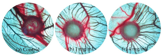 Compound DG-15 promoted angiogenesis in the CAM model with different concentrations: (a) Control group; (b) 1 mg/mL; (c) 4 mg/mL.