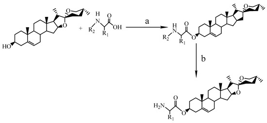 Synthesis of the diosgenin-amino acids derivatives DG-1 to 18. Reagents and Conditions: (a) EDCI, DMAP, DCM, 12 h; (b) TFA, DCM, ice bath, 1 h (Boc protecting group); Pd(OH)2/C, H2, MeOH, r.t. 12 h (Cbz protecting group).