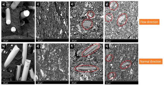 SEM images of PP with 30 wt.% (a,b) glass fiber; (c,d) talc; (e,f) BC 650; and (g,h) BC900 at 500×. (a,c,e,f) in flow direction and (b,d,f,h) in normal direction (the red ovals indicate biocarbon particles).