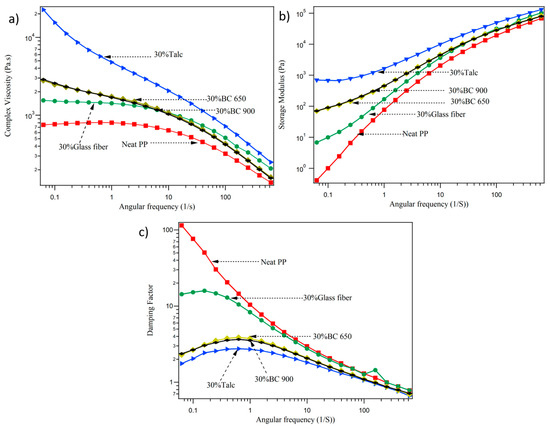 The rheological properties of composites are affected via the interactions between the matrix and the filler, size distribution, volume fraction, dispersion, particle size, and the shape of filler. The complex viscosity of neat PP and PP with different fillers is displayed in Figure 5a. Neat PP is a Newtonian flow behavior in which the complex viscosity is constant at lower applied angular frequency. By increasing angular frequency, the complex viscosity of neat PP decreased due to the disentanglement of PP chains, which indicates shear thinning (non-Newtonian flow behavior). As can be observed, the complex viscosity of PP filler composites was higher than for neat PP, which indicates that the filler needs longer relaxation time to flow as well at higher shear stress. PP with 30 wt.% glass fiber showed the same behavior as neat PP with higher complex viscosity. The higher shear stress of PP-Talc during the applied shear force may be due to the orientation of the talc, which disturbs the entanglements of the matrix chains. The complex viscosity of biocarbon composites increased compared to the neat polymer and decreased with increase in angular frequency. There was little difference in complex viscosity between the types of biocarbon used.