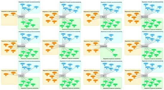 A compound library of over 2300 compounds from literature was generated for the herbs and spices presented in this study and the compounds were subsequently screened with the DIA-DB webserver (http://bio-hpc.eu/software/dia-db/). The DIA-DB webserver employs inverse virtual screening of compounds with Autodock Vina against a given set of 18 protein targets associated with diabetes [224]. These targets were aldose reductase (AKR1B1), AMY2A, DPP4, FBP1, free fatty acid receptor 1 (FFAR1), glucokinase (GCK), 11B-hydroxysteroid dehydrogenase type 1 (HSD11B1), insulin receptor (INSR), MGAM, NR5A2, pyruvate dehydrogenase kinase isoform 2 (PDK2), PPARA, PPARD, PPARG, PTPN9, liver glycogen phosphorylase (PYGL), RBP4, and retinoid X receptor alpha (RXRA). The major function of each of the protein targets can be found in Table 2 and have been broadly divided into three categories representing either their mode of action on insulin secretion and/or sensitivity, regulation of glucose metabolism, or regulation of lipid metabolism. Although these protein targets have been broadly divided into three major categories, their activity can be interconnected with one or more protein targets found in a different category. This is observed from evidence in literature on the regulation of GCK by NR5A2 and PPARG [225], GCK can act as a glucose sensor in pancreatic B-cells and stimulate insulin secretion [226], regulation of PDK2 activity by PPARA and PPARD [227], FFAR1 regulation by PPARG [228], HSD11B1 regulation by PPARG [229], and PPARG can promote insulin sensitivity by enhancing the expression and translocation of the GLUT transporters responsible for glucose uptake [229].