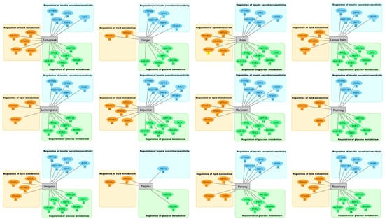 Herbs and spices are widely used in our daily lives as important seasonings and flavorings for our food. They are also commonly used for their health benefit properties such as antioxidant, anti-inflammatory, anticancer, anti-diabetic, antimicrobial, neuroprotective, and cardiovascular effects [18,19,20,21,22,23]. They represent attractive therapeutics interventions as they are complex mixtures of diverse compounds that can potentially and cooperatively modulate the activity of several dysregulated and interconnected disease targets. They are also widely available and are fairly inexpensive, with the exception of perhaps saffron. Although several studies can be found on the anti-diabetic activity of some of herbs and spices and in certain cases extensive scientific evaluations have been conducted, for the majority however, there is still a lack of scientific knowledge. The aim of this study was to provide insights into the bioactive compounds of these plants, as well as their molecular anti-diabetic mechanisms of action.