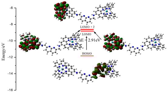 The simulations of the HOMO and LUMO electron density distribution in the frontier molecular orbitals of the complex are shown in Figure 1. It was observed that the LUMO and LUMO + 1 were distributed mostly on the 2,2′-bipyridine and 1,10-phenanthroline unit and that the LUMO + 2 was localized primarily on the two 2,2′-bipyridine units, but the HOMO orbital had amplitudes on the 1,10-phenanthroline unit in one of the Ru centers. The electron distribution of HOMO and LUMO provided strong evidence of the photoinduced electron transfer (PET) process in the new complexes [42,43,44].