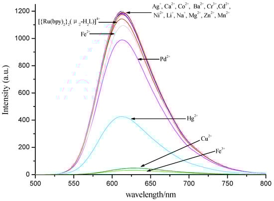 Fluorescence spectra of the complex [{Ru(bpy)2}2(μ2-H2L)]4+ (10−5 mol/L in CH3CN/H2O = 1:1, v/v, excitation wavelength = 450 nm) upon the addition of 5.0 equivalents of various metal ions at room temperature.