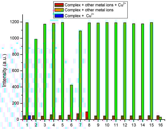 Changes in the fluorescence intensity of the complex [{Ru(bpy)2}2(μ2-H2L)]4+ (10−5 mol/L in CH3CN/H2O = 1:1, v/v, excitation wavelength = 450 nm) upon the addition of Cu2+ in the presence of other metal ions. The red bars represent the fluorescence intensity of [{Ru(bpy)2}2(μ2-H2L)]4+ upon the addition of 5.0 equiv. of Cu2+ in the presence of: 1 Cd2+, 2 Pb2+, 3 Ca2+, 4 Mg2+, 5 Zn2+, 6 Hg2+, 7 Fe2+, 8 Ba2+, 9 Ni2+, 10 Li+, 11 Mn2+, 12 Cr3+, 13 Na+, 14 Co2+, 15 Ag+, 16 Fe3+; the green bars represent the changes in the fluorescence intensity of [{Ru(bpy)2}2(μ2-H2L)]4+ upon the addition of other metal ions, respectively. The blue bar represents the fluorescence intensity of [{Ru(bpy)2}2(μ2-H2L)]4+ when 5.0 equiv. of Cu2+ were added.