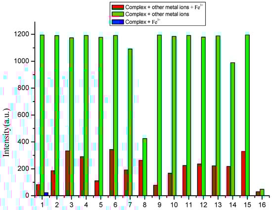 Changes in the fluorescence intensity of the complex [{Ru(bpy)2}2(μ2-H2L)]4+ (10−5 mol/L in CH3CN /H2O = 1:1, v/v, excitation wavelength = 450 nm) toward Fe3+ in the presence of other metal ions. The red bars represent the fluorescence intensity of [{Ru(bpy)2}2(μ2-H2L)]4+ when 5.0 equiv. of Fe3+ were added in the presence of: 1 Ag+, 2 Ba2+, 3 Ca2+, 4 Cd2+, 5 Co2+, 6 Cr3+, 7 Fe2+, 8 Hg2+, 9 Li+, 10 Mg2+, 11 Mn2+, 12 Na+, 13 Ni2+, 14 Pb2+, 15 Zn2+, 16 Cu2+; the green bars represent the changes in fluorescence intensity of [{Ru(bpy)2}2(μ2-H2L)]4+ when other metal ions were added, respectively. The blue bar represents the fluorescence intensity of [{Ru(bpy)2}2(μ2-H2L)]4+ when 5.0 equiv. of Fe3+ were added.