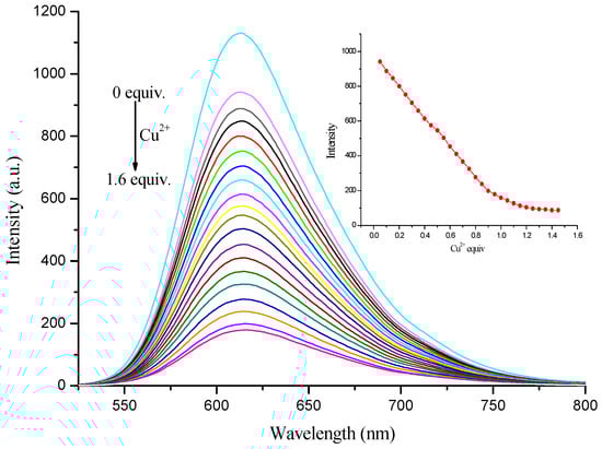 Emission spectra of the complex [{Ru(bpy)2}2(μ2-H2L)](PF6)4 (10−5 mol/L in CH3CN/H2O = 1:1, v/v, excitation wavelength = 450 nm) upon the addition of Cu(ClO4)2 (0–1.0 equiv.) at room temperature; the plot of emission intensity at 612 nm vs. the added Cu2+ equivalents is shown in the inset.