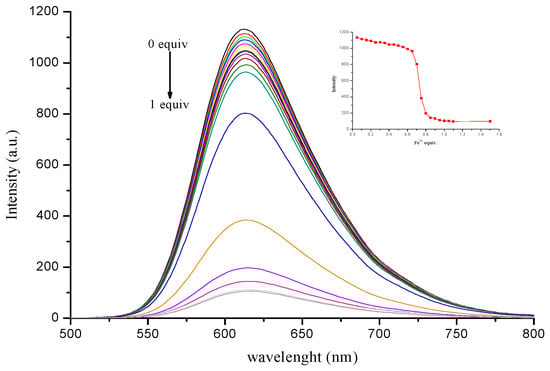 Emission spectra of the complex [{Ru(bpy)2}2(μ2-H2L)](PF6)4 (10−5 mol/L in CH3CN/H2O = 1:1, v/v, excitation wavelength = 450 nm) upon the addition of Fe(ClO4)3 (0–1.6 equiv.) at room temperature; the plot of emission intensity at 612 nm vs. the added Fe3+ equivalents is shown in the inset.